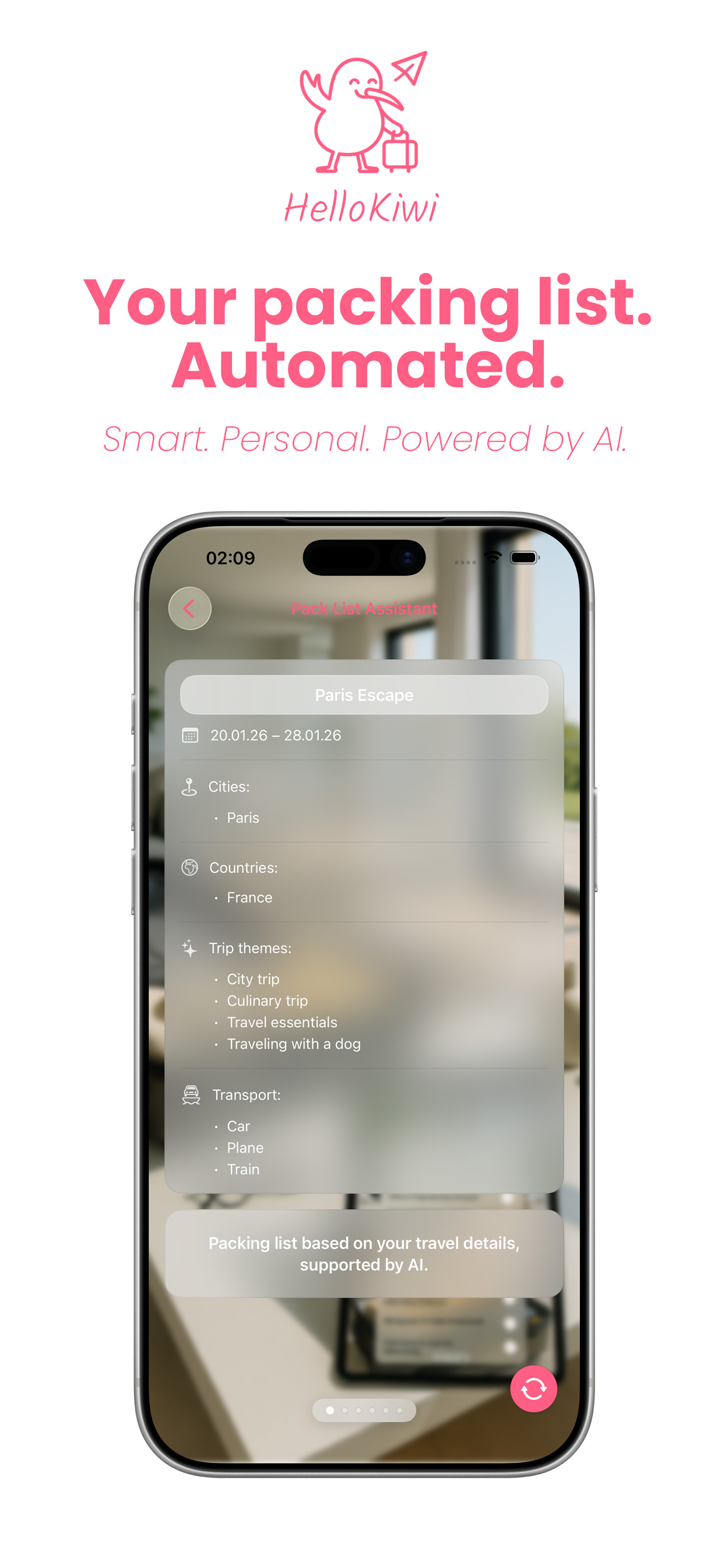 HelloKiwi suggests what fits your trip and adds smart extras if you want. Your own items stay editable at all times — everything in one clear list.
