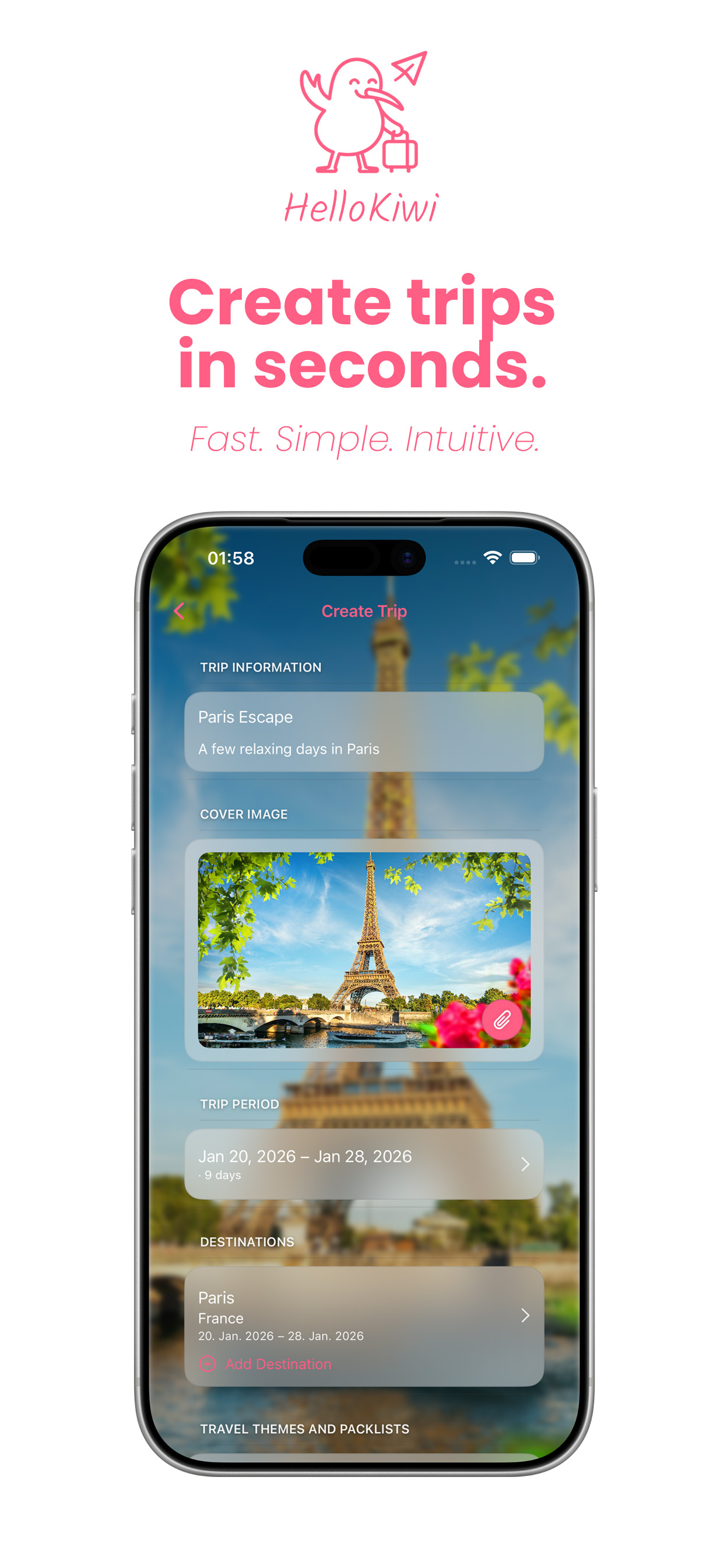 Create trips in seconds and let HelloKiwi organize everything for you. Dates, destinations and key information are clearly structured — without spreadsheets, notes or manual sorting.