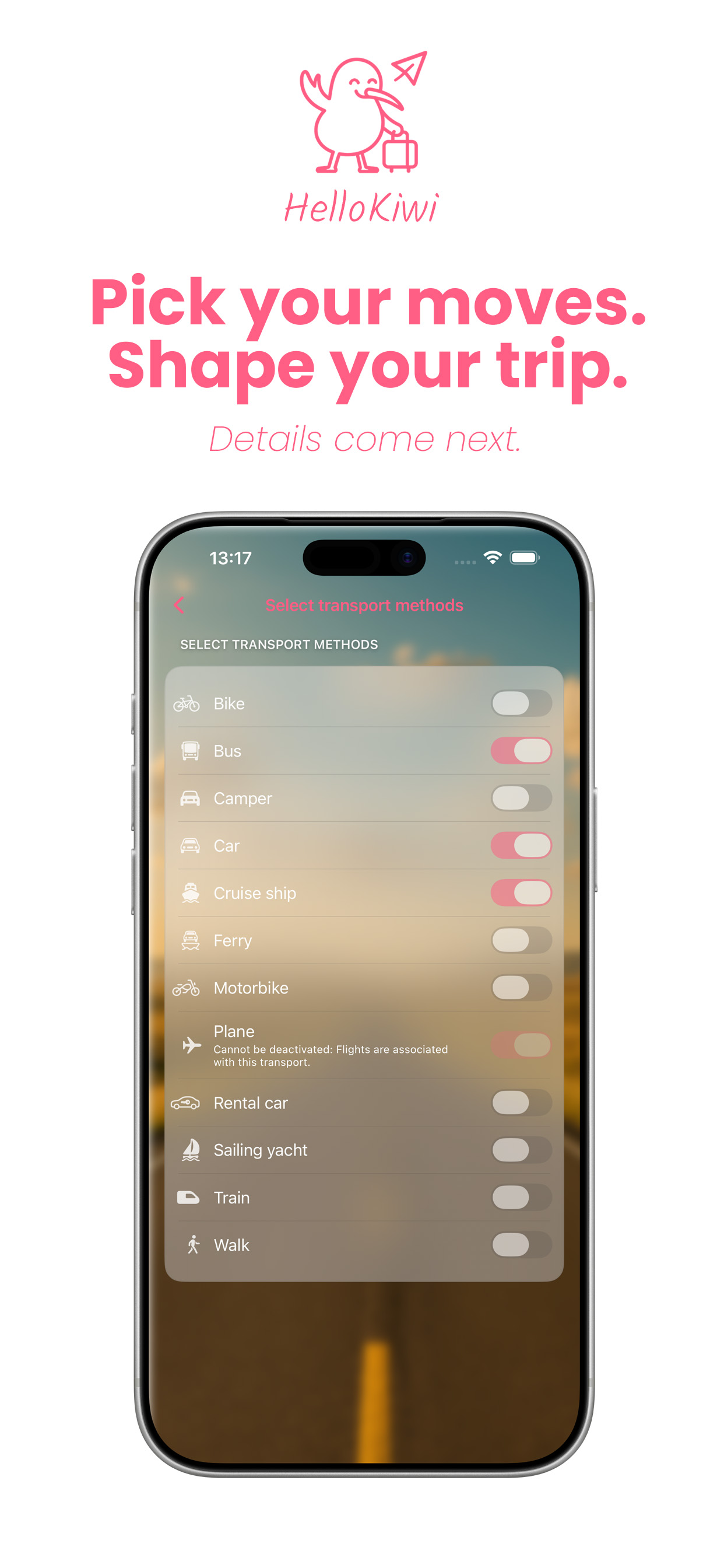 Sync your trips via iCloud or use HelloKiwi completely offline. Your data stays safe on your device. You decide how you plan.