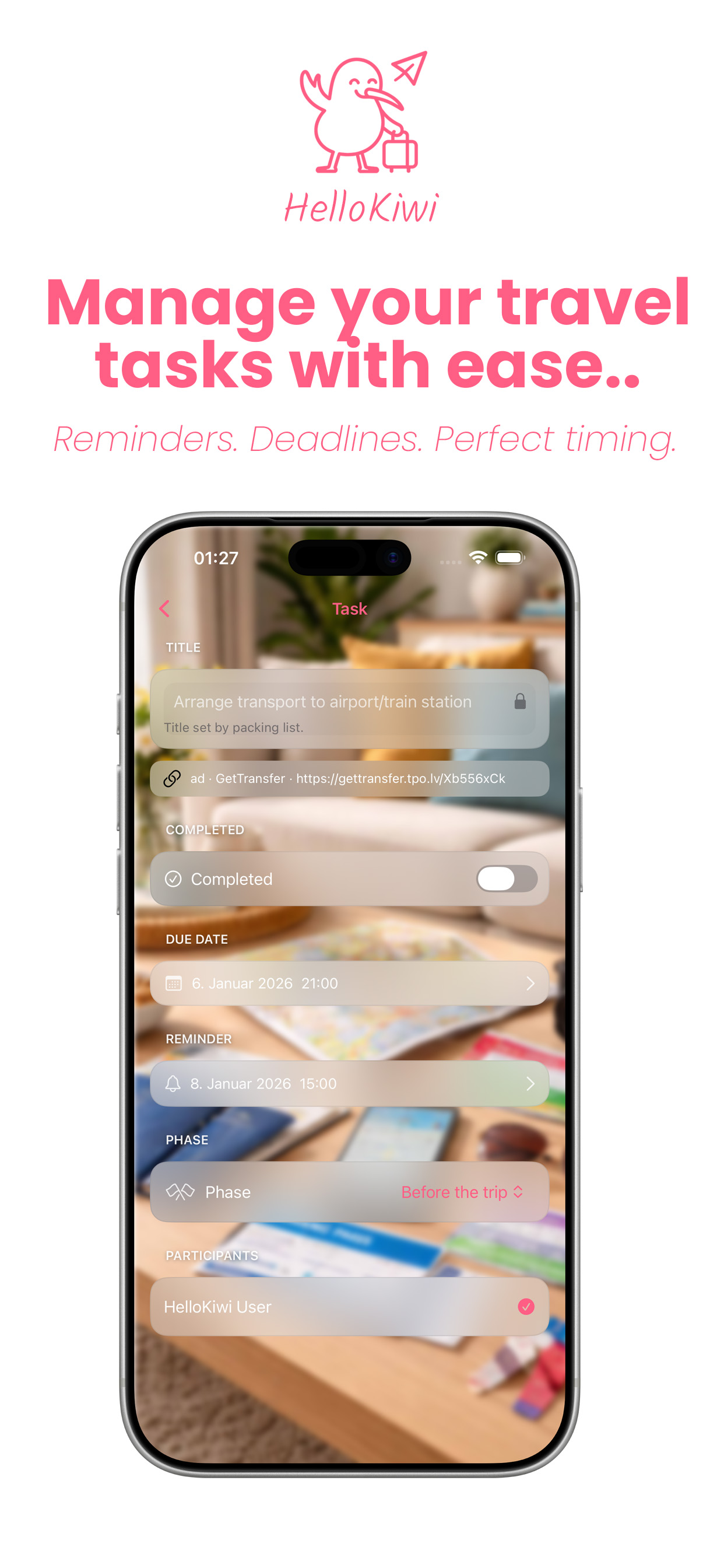 Tasks, reminders and deadlines help you keep track of what matters — so you can focus on enjoying your trip instead of managing it.